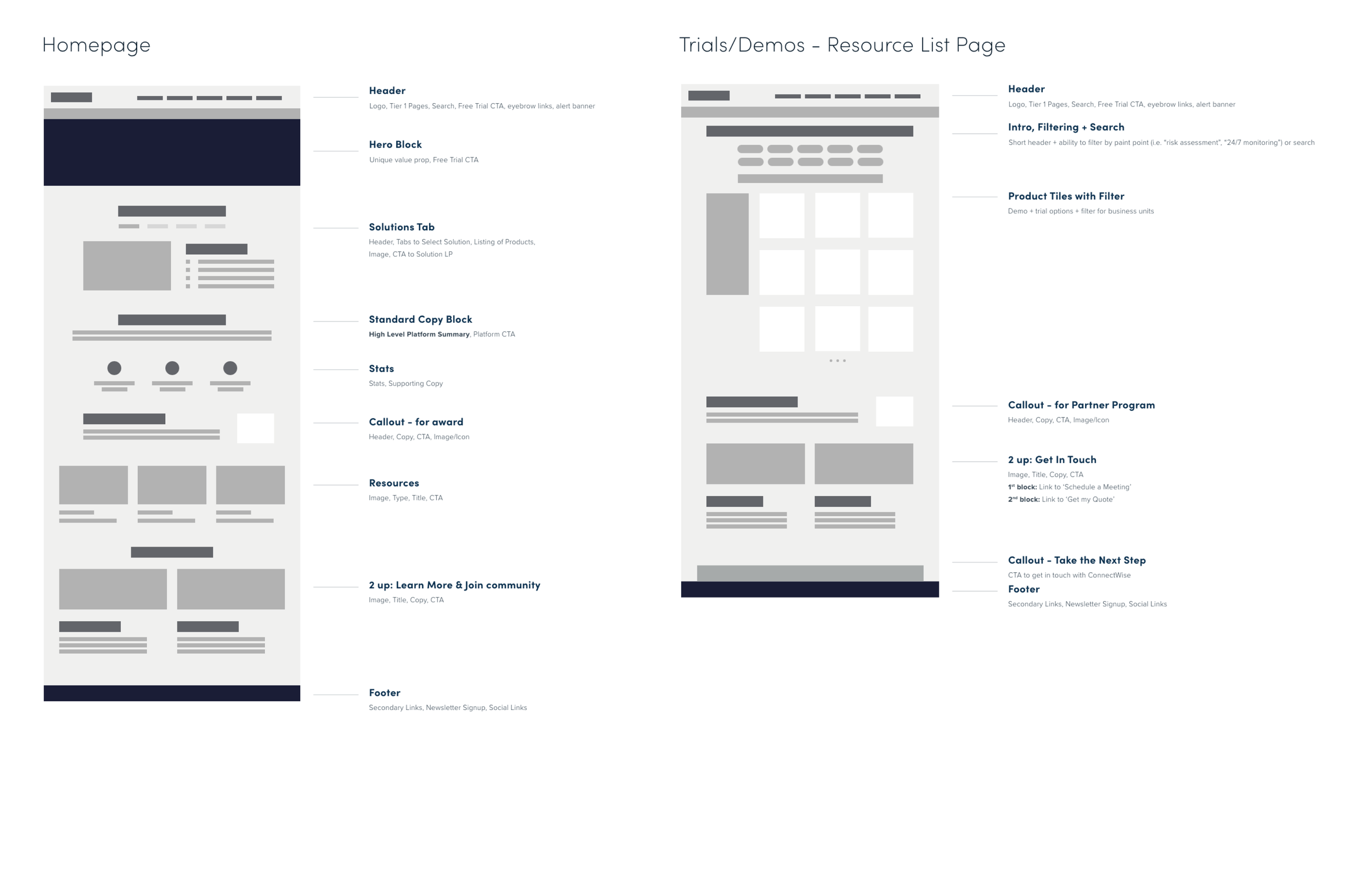 As with any web redesign project, research was the first step. We researched ConnectWise’s competitors and comparators in order to get an idea of how they were acting in a similar space. We also analyzed what ConnectWise could do in order to stand out while also creating similar patterns we felt were working on other sites.